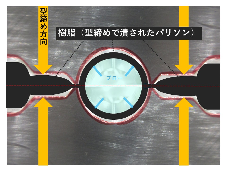 ※ピンチオフ:パリソンを金型で挟み込み、密封・溶着し、余肉(フラッシュ)を切り離すための部位。